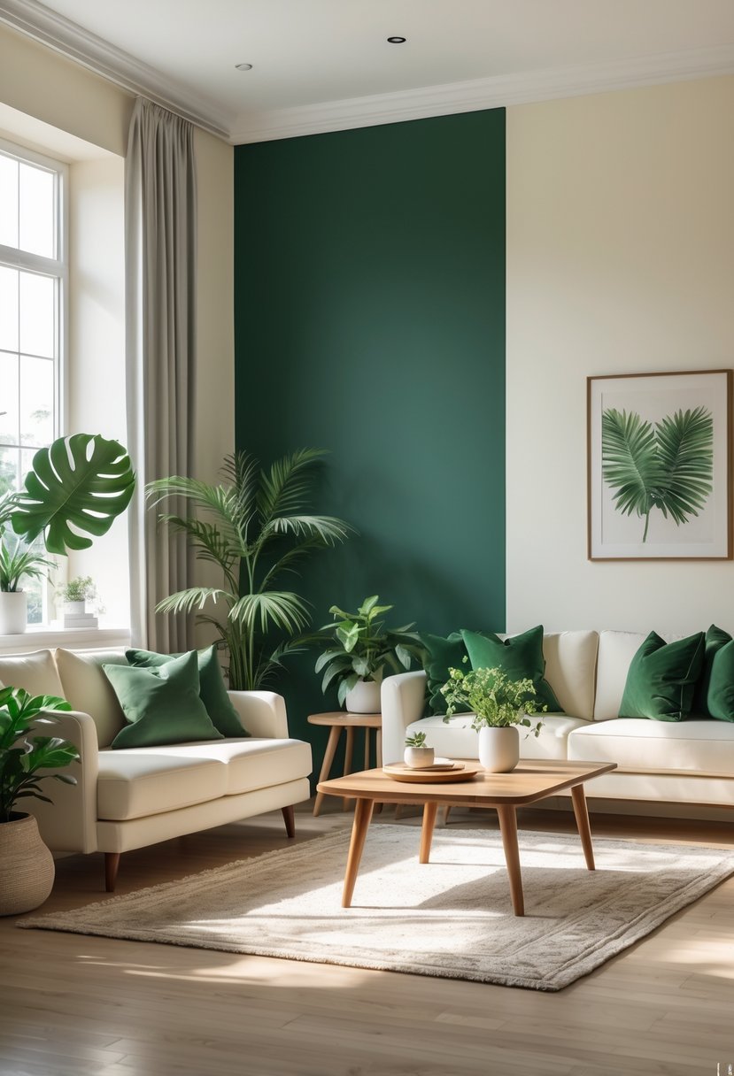 This palette works well in living rooms or bedrooms where a calm, inviting atmosphere is desired. The contrast is subtle yet effective, highlighting the depth of the green without overwhelming the space.