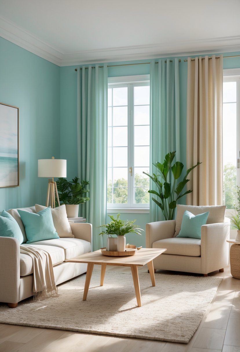 Sandy beige grounds the space, evoking the warmth of natural beach sands. Together, these colors work well in bedrooms and living areas where relaxation is key.