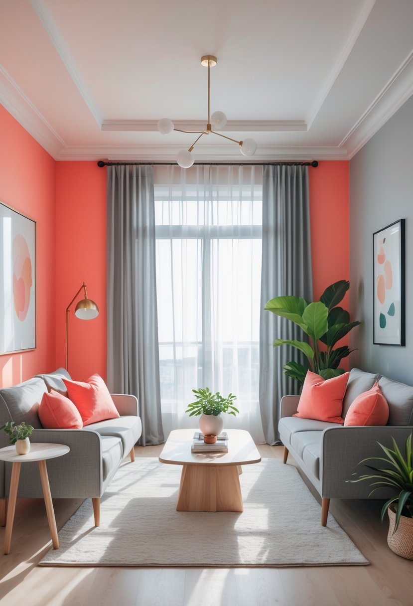 I find vibrant coral paired with light grey to be a balanced, modern choice. The coral adds warmth and energy, while the light grey tones it down with calmness. This combination works well in living rooms or bedrooms where you want both liveliness and relaxation.