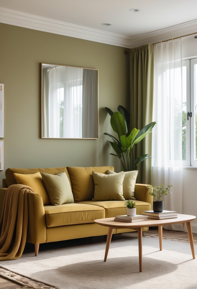 I find muted mustard and soft olive create a grounded, natural palette that feels warm without overpowering a space. Olive green works well on larger surfaces like walls or sofas, providing an earthy foundation.