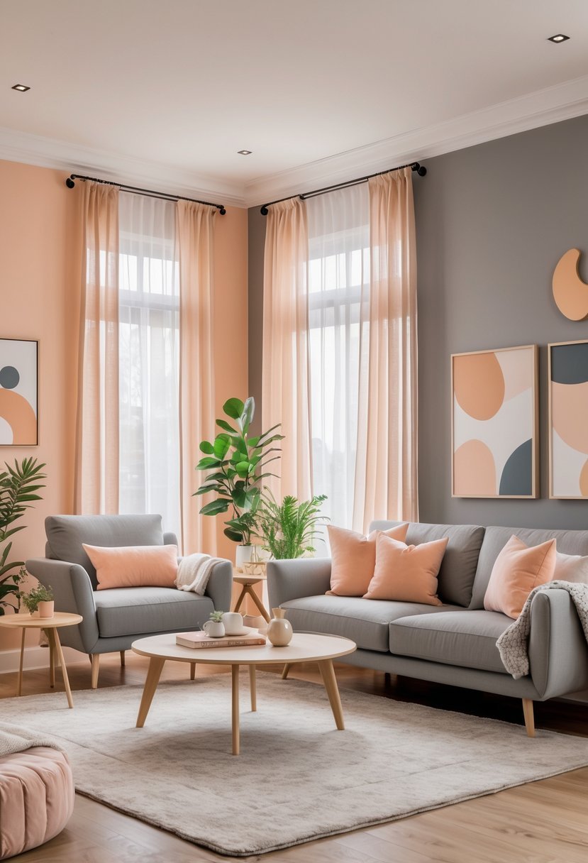 Warm grey serves as a neutral anchor that complements the gentle peach tones well. This combination works particularly in living rooms and bedrooms, where I want comfort and elegance.