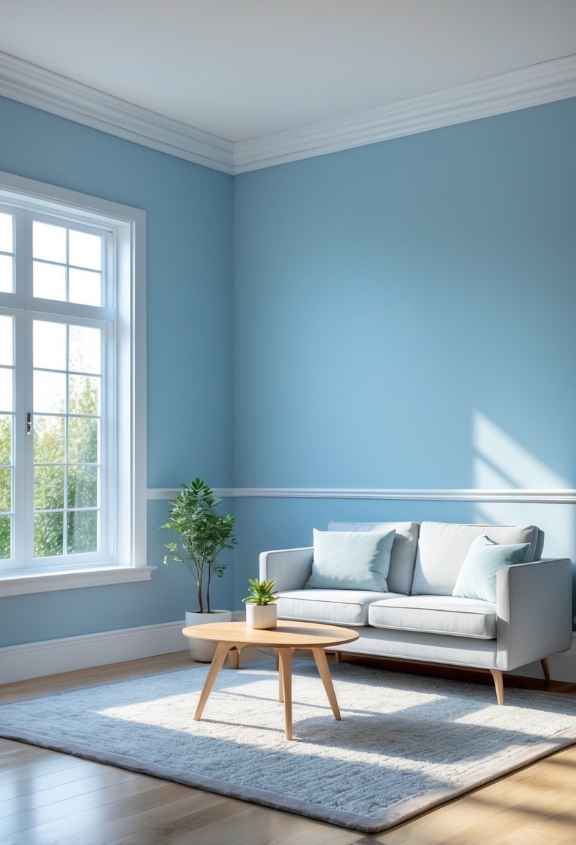 I find soft sky blue to be an excellent choice for creating a calm and airy space. When paired with crisp white trim, it adds a clean, fresh contrast that enhances the room’s brightness.