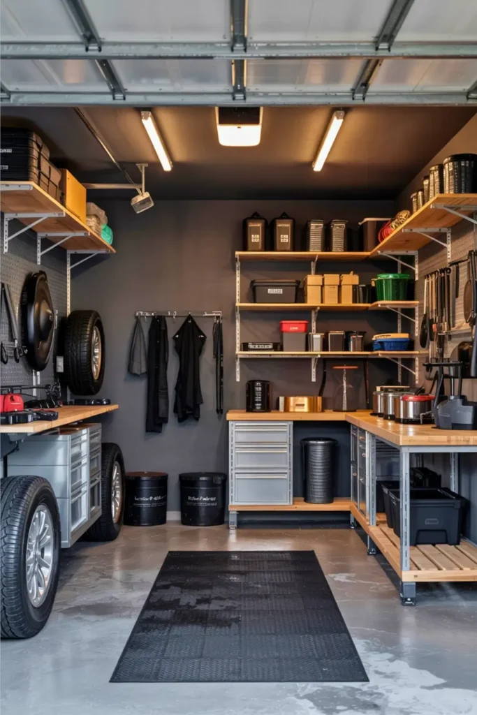 Pro Tip: Install plenty of LED strip lighting under shelves and workbenches—charcoal gray looks amazing when properly lit but can feel dungeon-like without enough illumination.