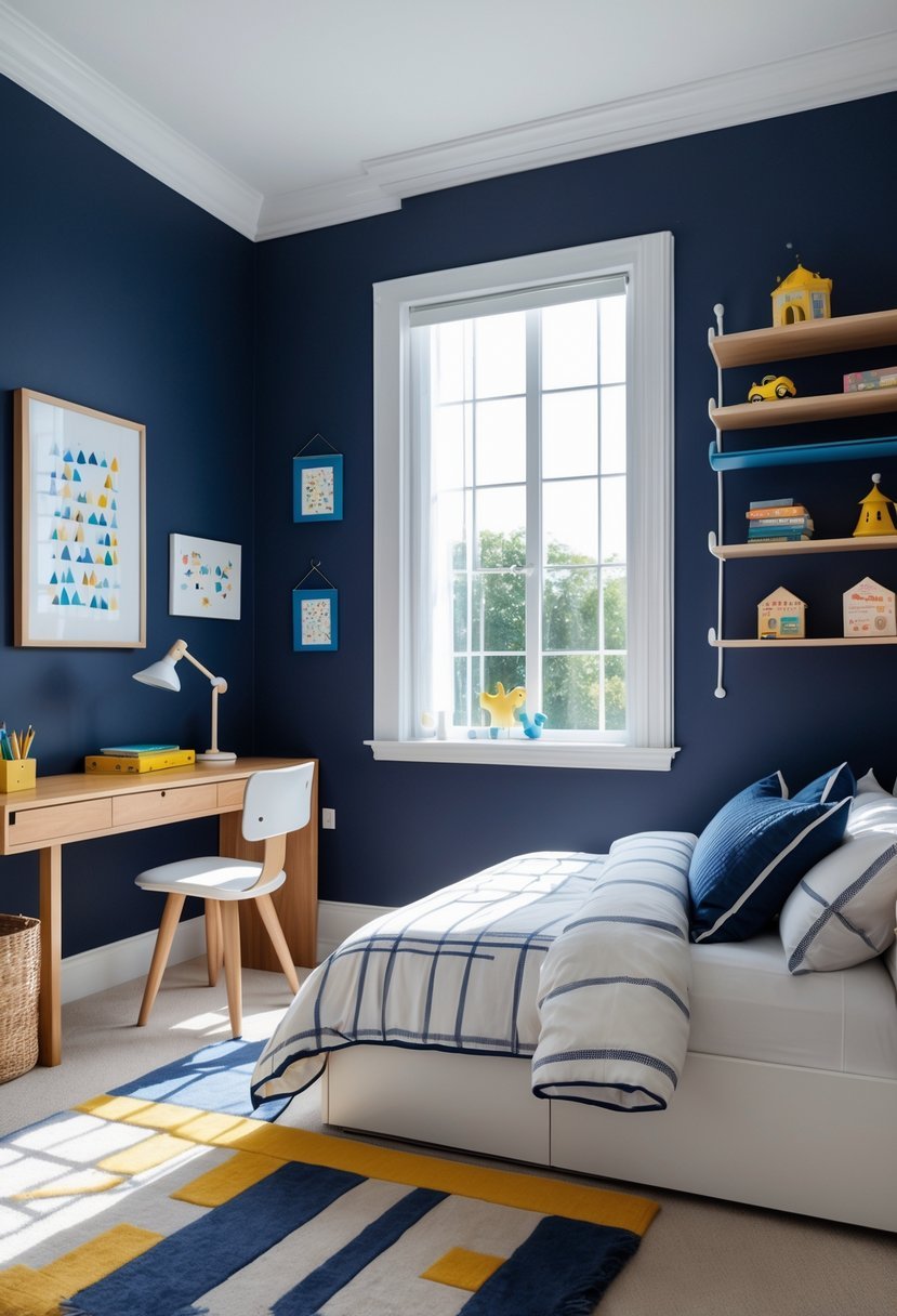 I find classic navy blue to be a timeless choice for boys’ bedrooms. It works well as a bold backdrop that adapts to different styles as a child grows.