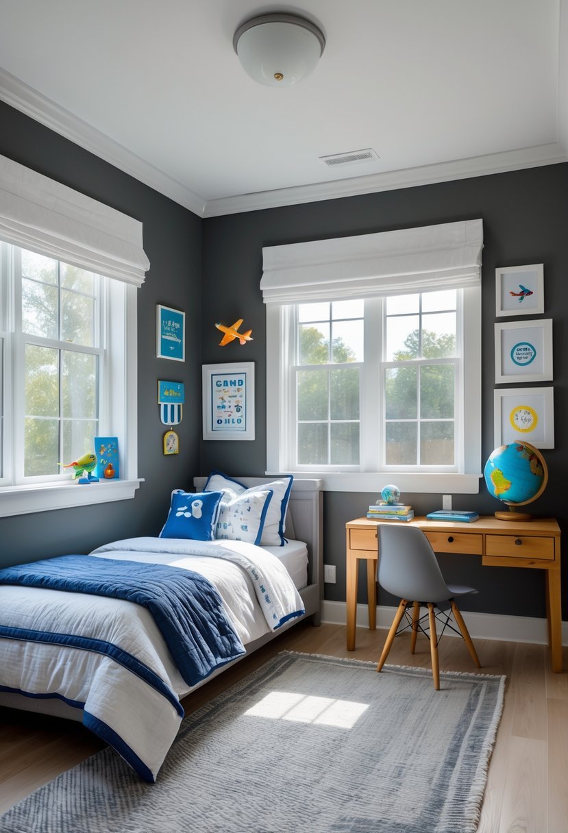 I like charcoal gray for boys’ bedrooms because it creates a modern, sophisticated look. The deep tone adds depth without overwhelming the space. Pairing it with crisp white trim brings balance and brightness.