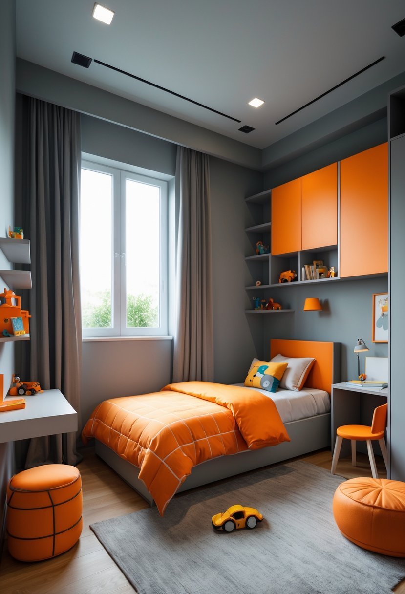 This color combo works well for boys who enjoy bold colors but need a space that feels mature and versatile. I find that using gray as the main wall color with orange accents, like bedding or artwork, keeps the room lively without being overwhelming.