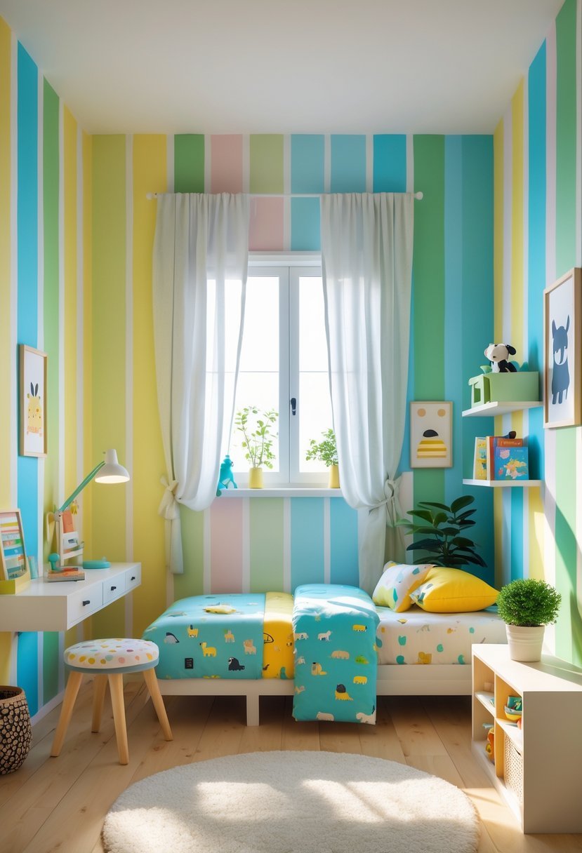 Stripes offer visual interest without overwhelming the space. They encourage creativity and make the room feel welcoming.