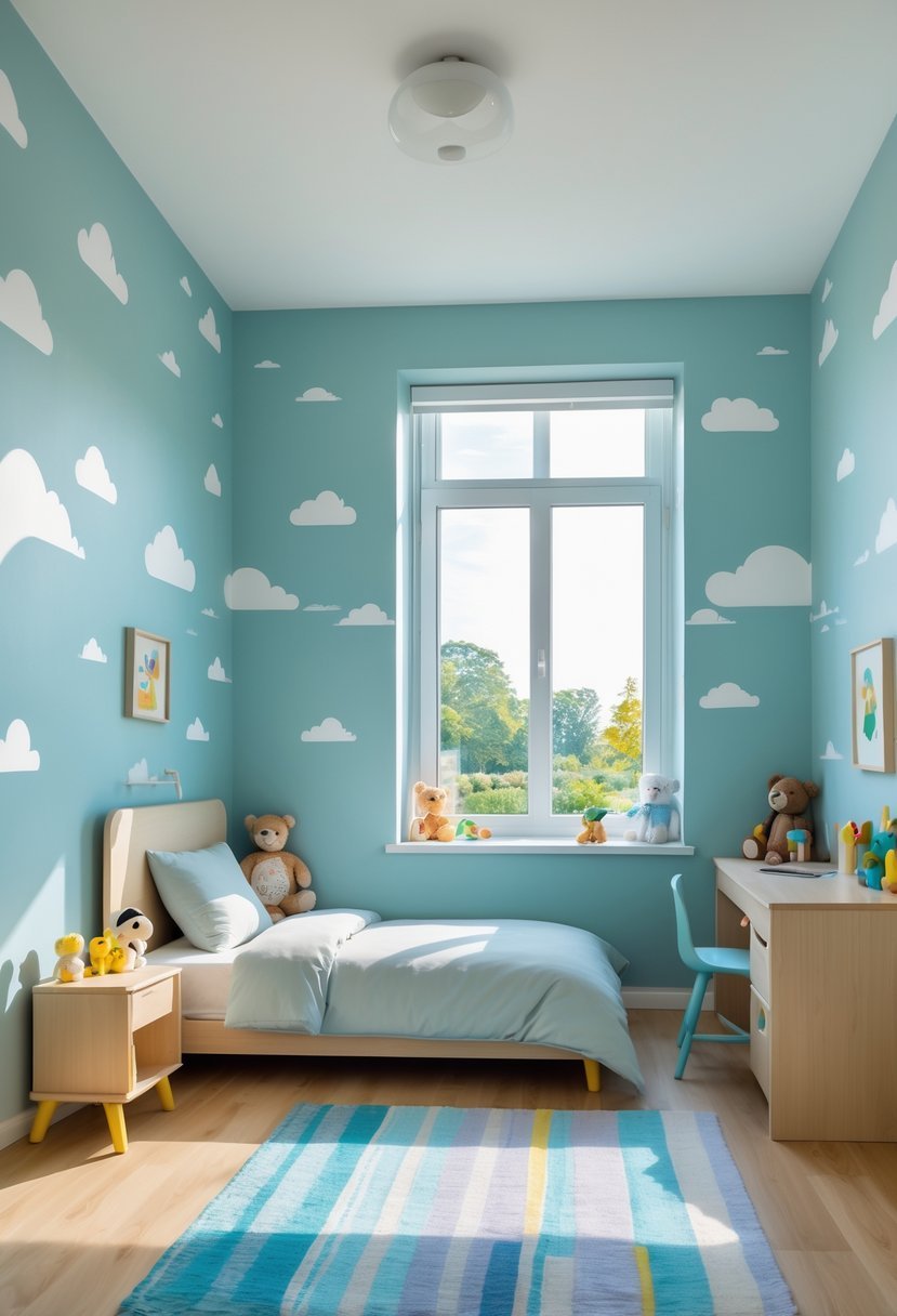 I find powder blue paired with cloud patterns creates a calm and inviting atmosphere for a boy’s bedroom. The soft blue base mimics the sky, while the clouds add playful, gentle detail without overwhelming the space.