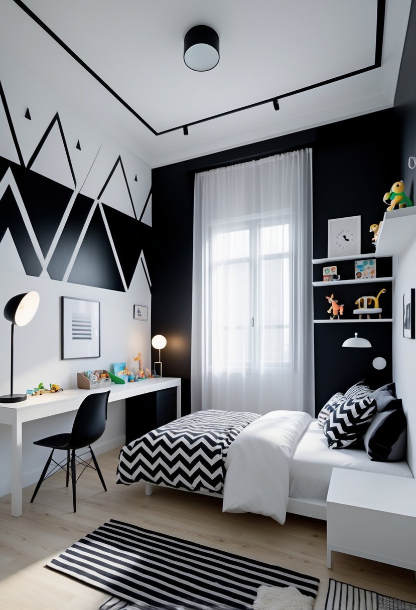 I find modern black and white geometric designs to be a striking choice for boys’ bedrooms. Using sharp shapes like triangles, squares, or parallelograms creates a bold and clean look that works well from childhood through teenage years.