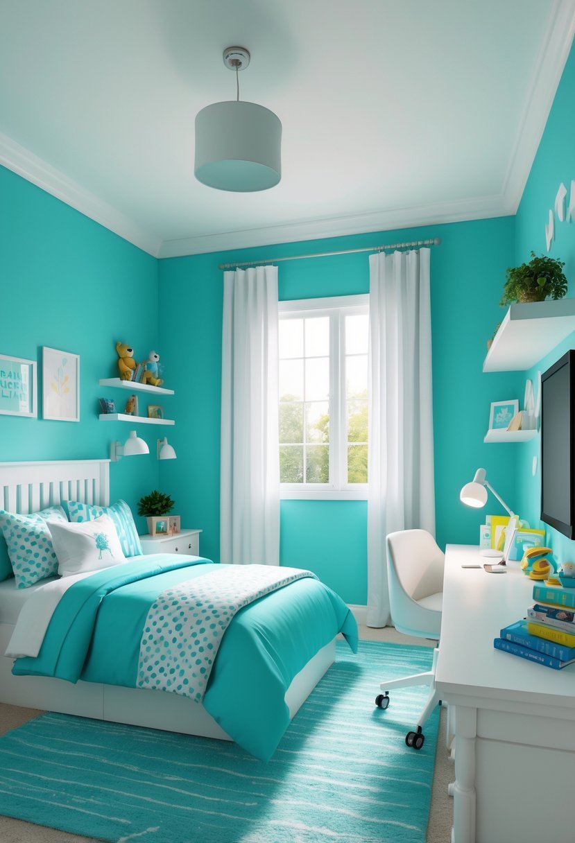 White bedding or furniture against turquoise walls adds contrast without overwhelming the space. This combination also allows flexibility with accessories and decor to suit different tastes.