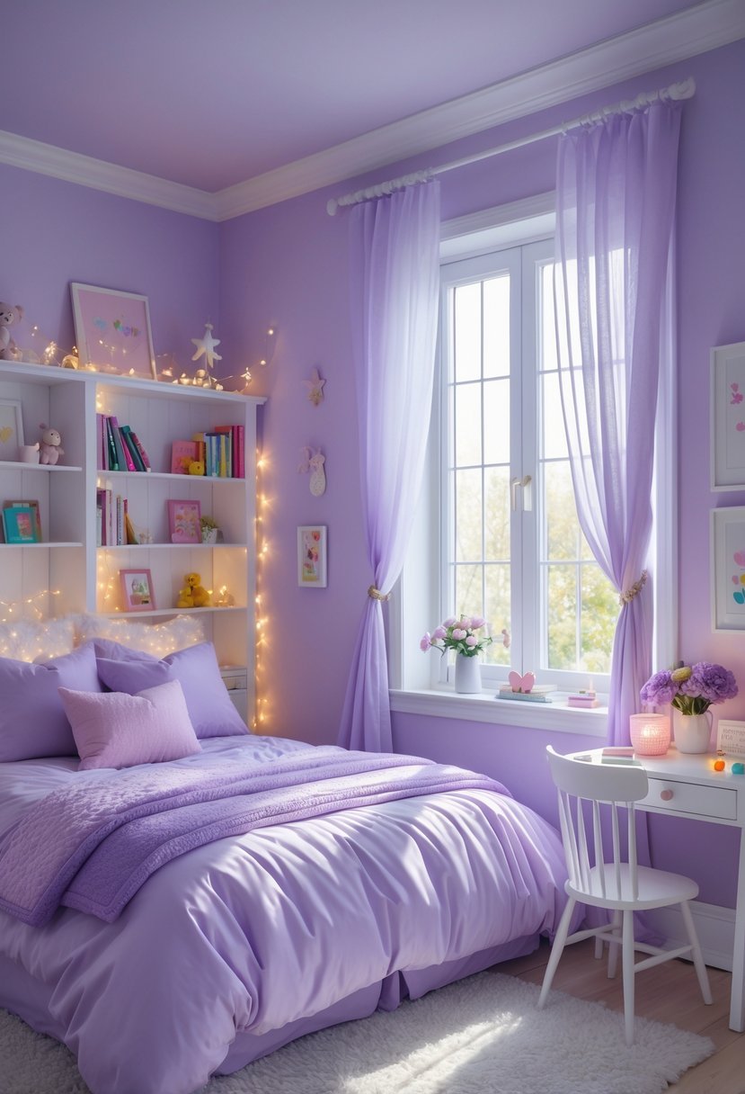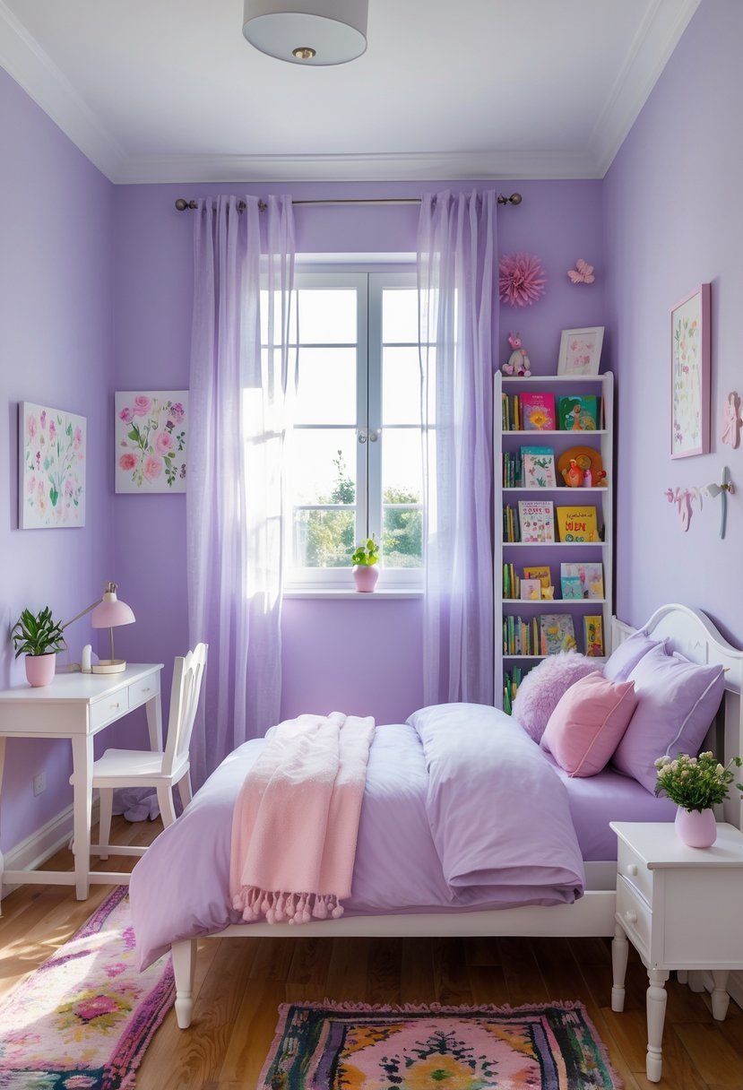 I find soft lavender to be an excellent choice for a girl’s bedroom paint. It creates a calm and soothing atmosphere without overwhelming the space. The color works well with white trim, which adds a clean, fresh contrast.