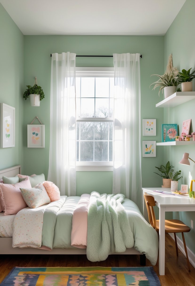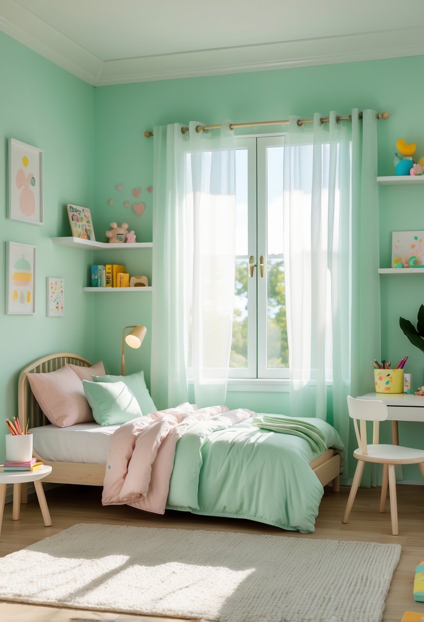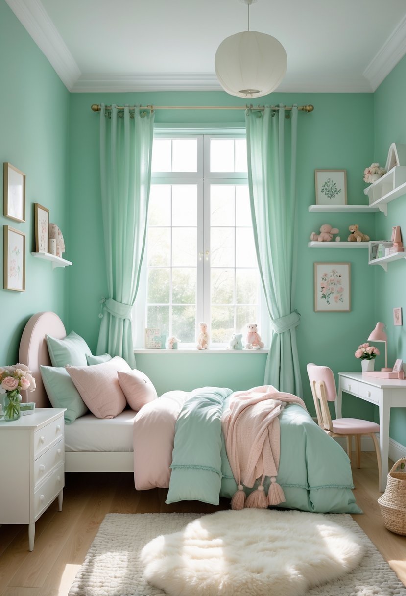 I find mint green to be a refreshing choice for a girl’s bedroom. It strikes a good balance between calm and modern, making the room feel both peaceful and stylish.