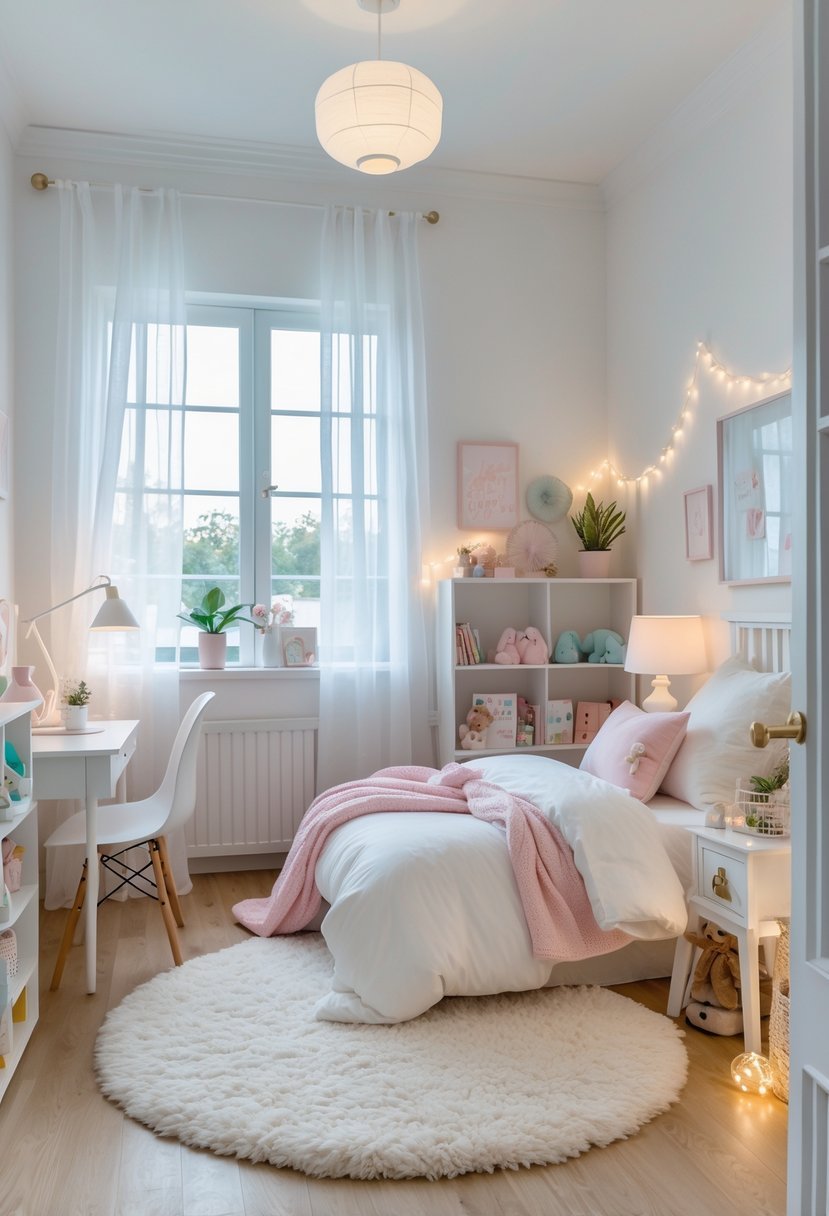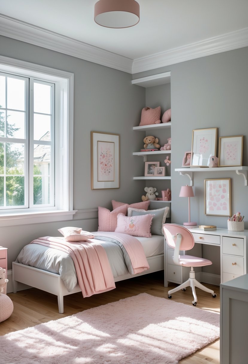 I find pale gray to be a versatile and calming choice for a girl’s bedroom. It creates a neutral backdrop that works well with both soft pastels and brighter accent colors.