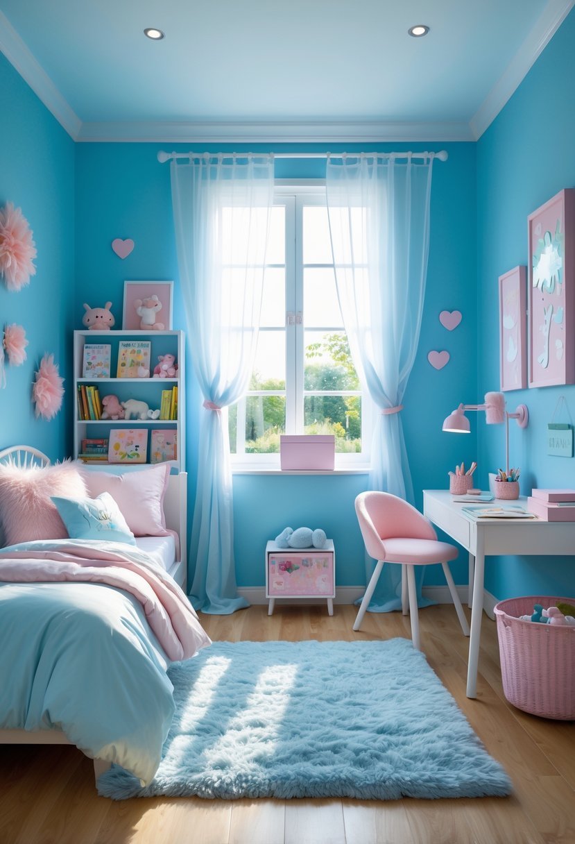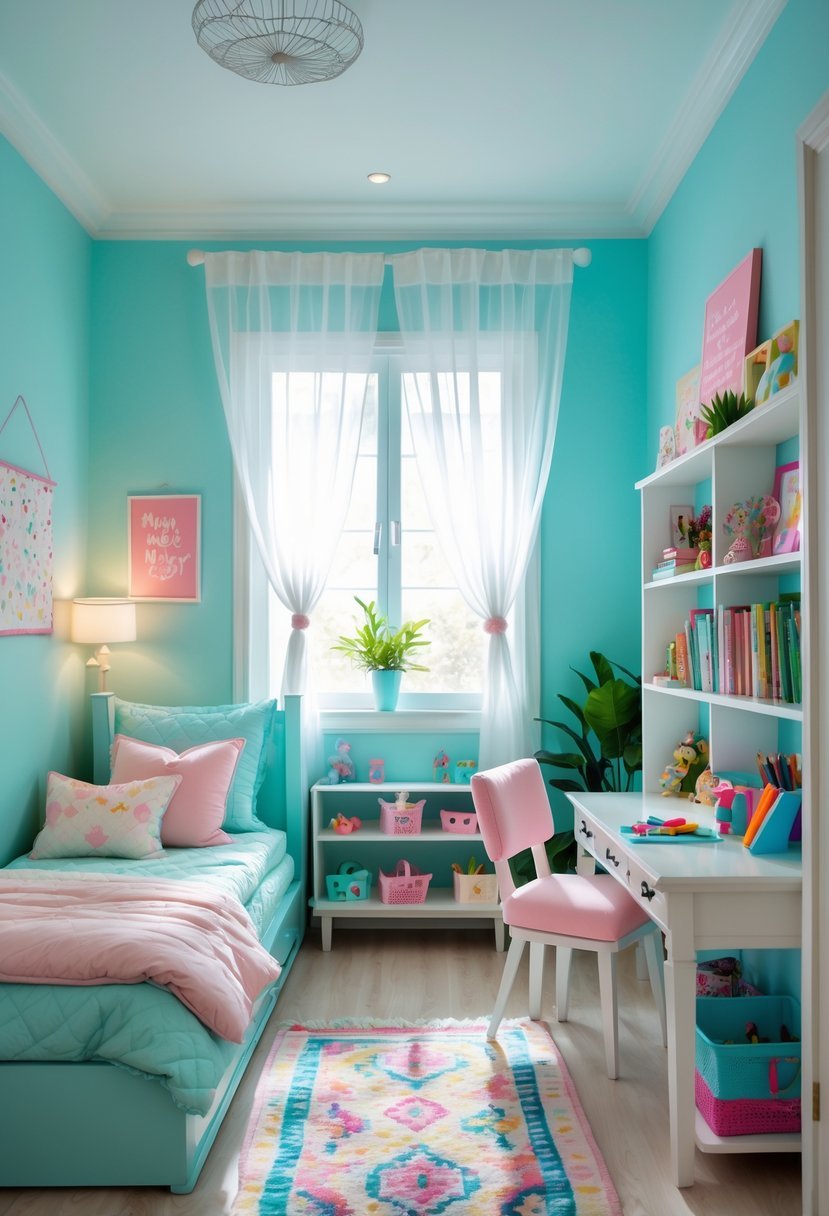 I find soft aqua to be a versatile and calming choice for a girl’s bedroom. It brings a fresh, light atmosphere without feeling overwhelming.