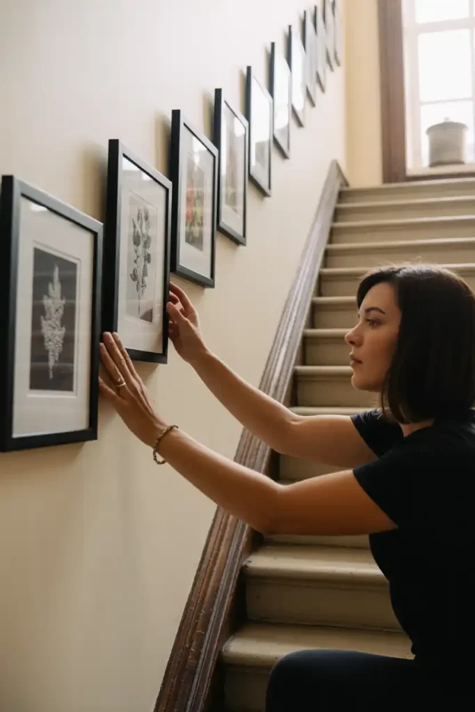 A gallery wall that climbs diagonally alongside the steps looks super professional. It guides the eye upward naturally. This simple alignment trick makes a huge difference in how polished your staircase wall decor looks.